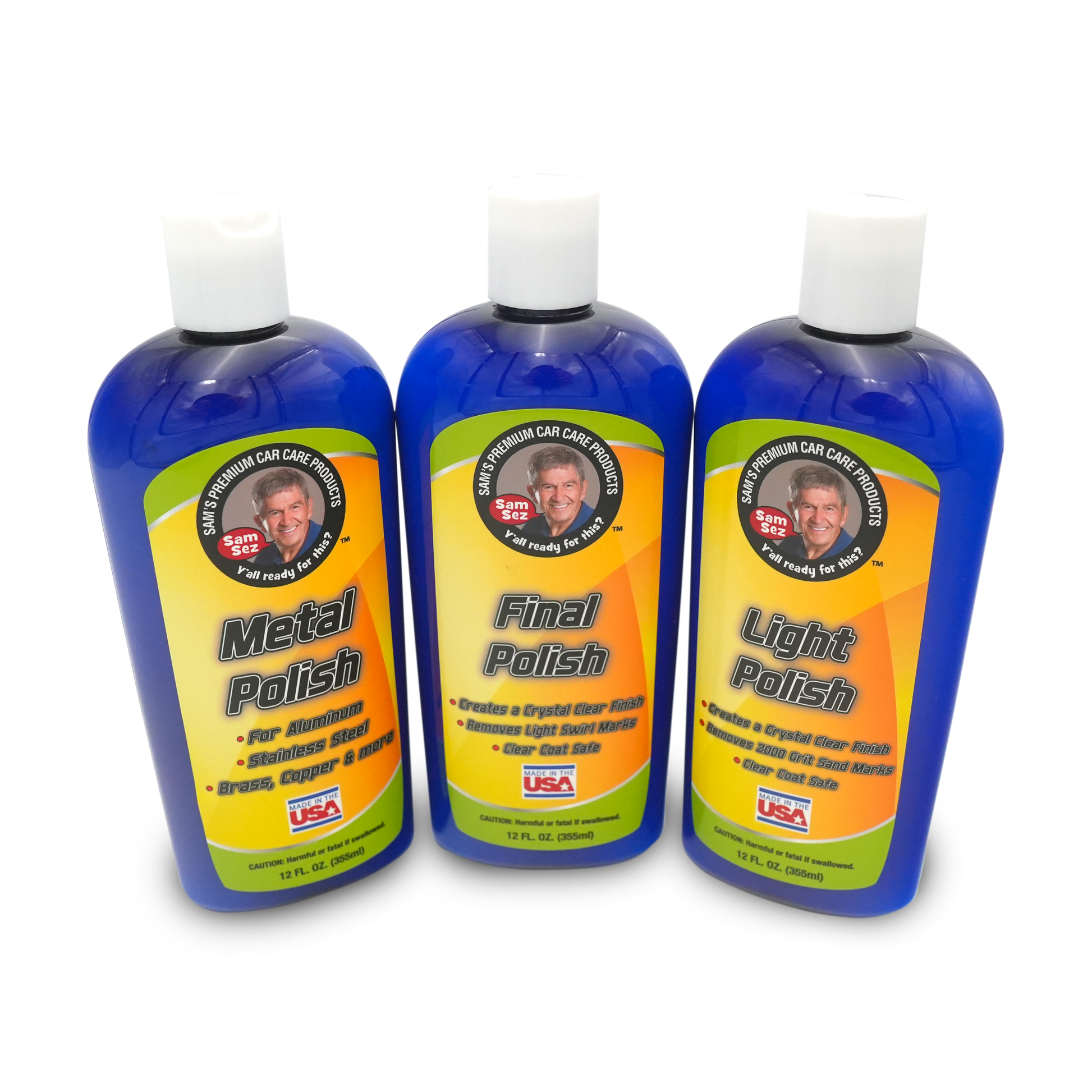 Final Polish: Shake well before use. Make sure the surface is clean, dry, and free of contaminants. Bonded contaminants should first be removed using a clay bar. Do not use in direct sunlight or surfaces hot to the touch. When using a dual-action polisher, apply three dime size amounts to a foam or microfiber hook and loop pad per each 12" x 12" area. Run DA on #6 setting using slow back and forth, up and down motions until polish turns clear. When using a high speed circular polisher, equip the machine with a foam or wool finishing pad. Apply 4 dime size amount to the pad. Set RPMs at 1500 and use a slow back and forth motion until polish turns clear. Remove residue using a clean dry microfiber towel. For optimum results, follow by using Sam’s Paint Protection for a long lasting shine and protection.